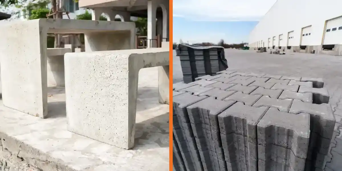 Exemplos de artefatos de concreto como bancos urbanos e pisos intertravados usados em obras e pavimentação