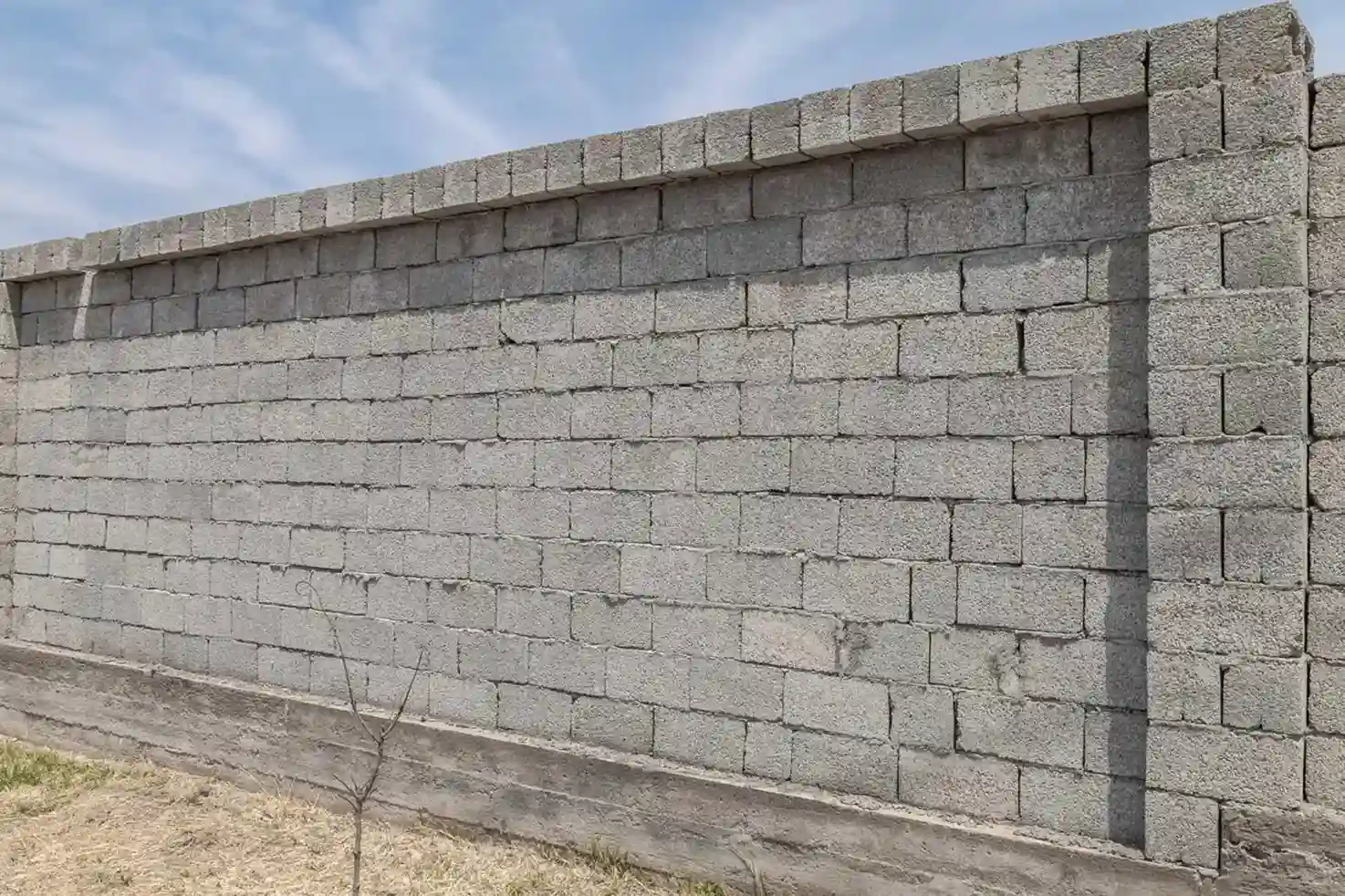Muro de bloco de concreto finalizado com estrutura alinhada e acabamento superior reforçado